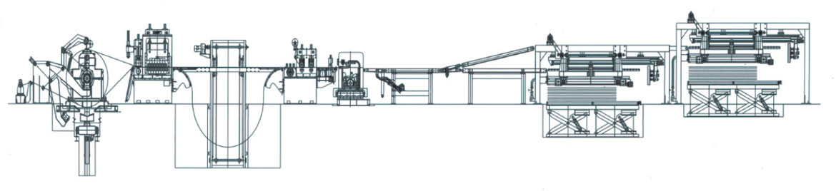 通常由上料小車、開卷機、引頭裝置、校平主機、活動過橋、導向糾偏裝置、定尺機構、覆膜裝置、飛剪主機、輸送工作臺、氣動排料架、液壓升降垛料臺、運料滾道臺及液壓、氣動及電氣控制系統等組成。